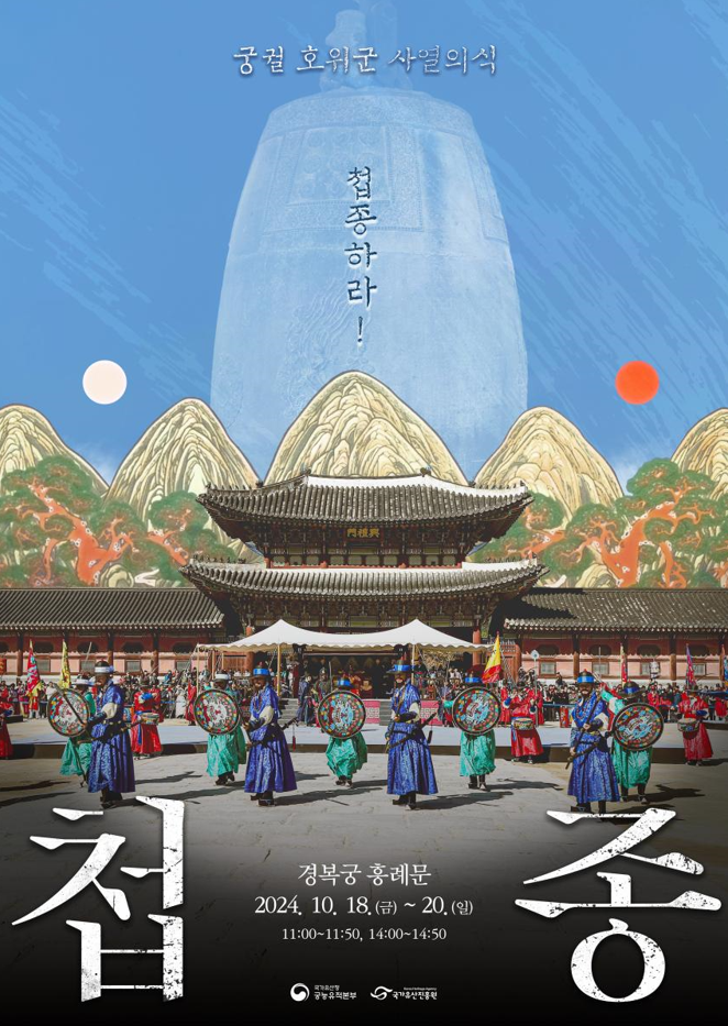 국가유산청 궁능유적본부(본부장 이재필)는 국가유산진흥원(원장 최영창)과 10월 18일부터 20일까지 3일간 하루 2회(오전 11시, 오후 2시) 경복궁 흥례문 앞(서울 종로구)에서 <2024년 궁궐 호위군 사열의식 ‘첩종(疊鐘)’> 행사를 개최한다.