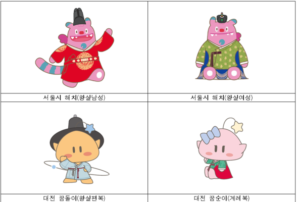 지자체 마스코트들도 한복을 입고 귀성객을 맞이한다. ‘해치’(서울), ‘꿈돌이&꿈순이’(대전), ‘강원이&특별이’(강원), ‘부기’(부산), ‘하모’(진주), ‘투어몽’(전북) 등의 마스코트를, 한복 입은 모습의 이미지로 제작해 선보인다. 특히 서울도서관 광장(9. 22.~10. 26.)과 서울공예박물관 앞마당(9. 29.~10. 26.)에는 방문객들이 사진을 함께 찍을 수 있도록 왕실 한복을 입은 ‘해치’ 풍선모형을 설치한다.