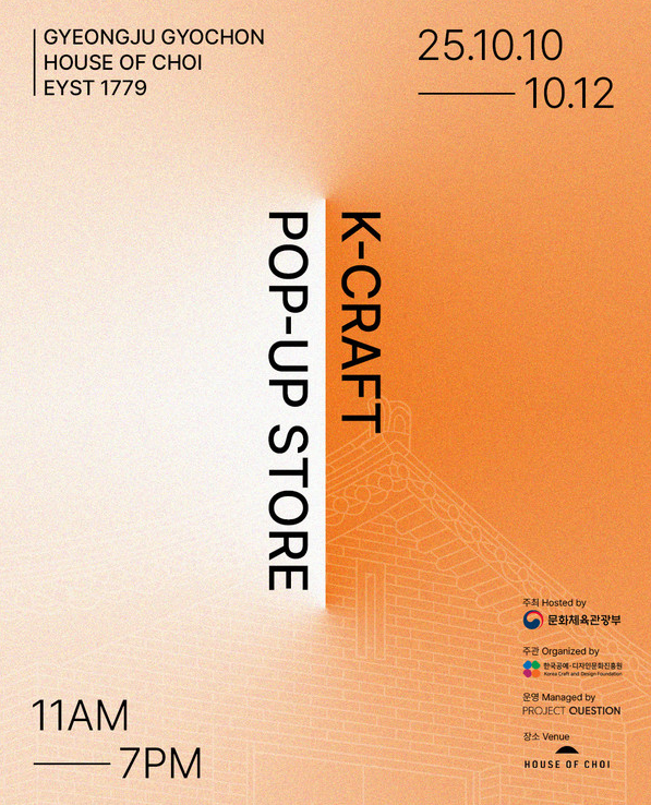 'K공예 팝업스토어'가 APEC 개최 도시인 경주에서 오는 10일부터 12일까지 3일간 열린다. 이번 행사는 문화체육관광부가 주최하고 한국공예·디자인진흥원이 주관하며, 한국을 대표하는 공예 브랜드 30곳이 참여할 예정이다.