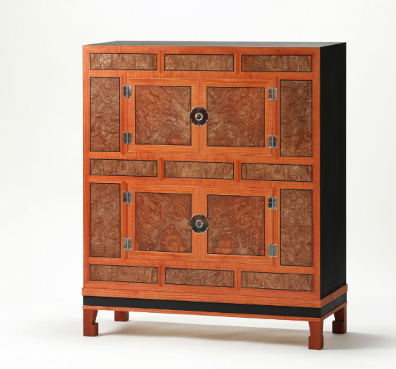 작품의 기본 짜임에는 참죽나무를 적용해 구조적 안정성을 확보했고, 장 앞판(알판)에는 고목 수종의 단단한 깊이를 지닌 느티나무 용목을 사용해 세월의 결을 층층이 드러냈다. 서랍과 내부 설계의 몸통은 오동나무로 제작해 무게와 습도 환경을 고려한 실용 설계에 방점을 찍었다. 금속 장식인 장석에는 은은한 광택의 백동을 택해 전통 가구 특유의 기품과 소재 대비감을 살렸다. 가구 하단에 가미된 절제된 어두운 색조의 블랙 포인트는 전통 색감의 과장 없이 현대 공간과 자연스럽게 잇기 위한 조형 실험으로 평가됐다.