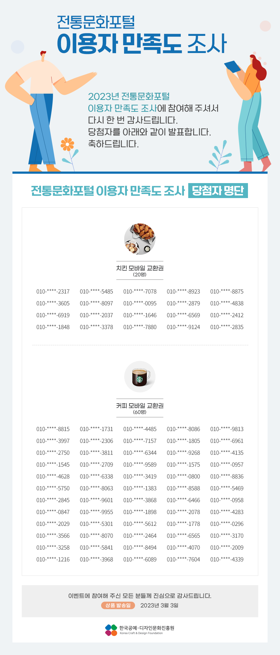 2023년 전통문화포털 이용자 만족도 조사에 참여해 주셔서 다시 한번 감사드립니다. 당첨자를 아래와 같이 발표합니다. 축하드립니다.